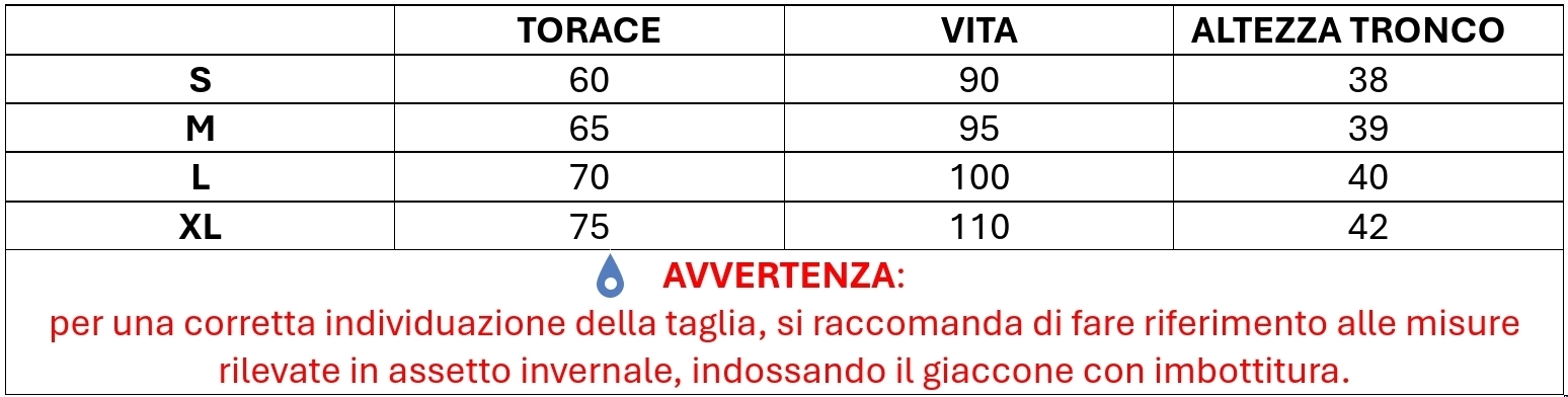 Taglie S - M - L - XL (vedere tabella riportata di seguito)